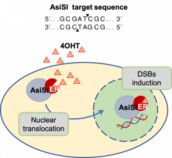 We transduced the MCF10A cells with a retroviral vector expressing the fusion protein between the HA-tagged AsiSI restriction enzyme and a modified hormone-binding domain from the estrogen receptor. Cell exposure to 4-hydroxytamoxifen (4OHT) results in nuclear accumulation of the AsiSI fusion protein and in the rapid induction of approximately 150 sequence–specific DSBs across the genome (Figure 2). Based on our previous studies in U2OS and MCF10A, AsiSI dependent DSBs induce canonical DDR activation, which is followed by progressive resolution of DSBs.