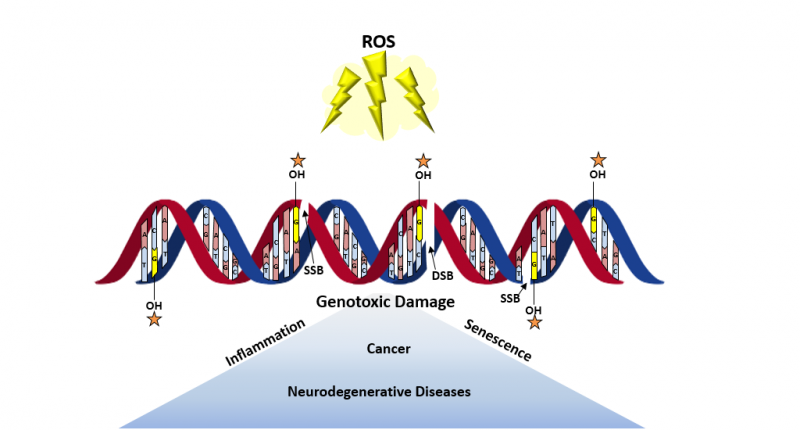 Reactive oxygen species are produced continually from normal cellular metabolism, but may be produced in excess, leading to oxidative stress. In the DNA context, deoxyguanosine (G) is particularly susceptible to the action of ROS (Reactive Oxygen Species) and undergoes an oxidative process generating the 8-oxodG. The enzymatic removal of 8-oxodG is catalyzed by nucleotide excision repair (NER) or by base excision repair (BER) mechanisms.
